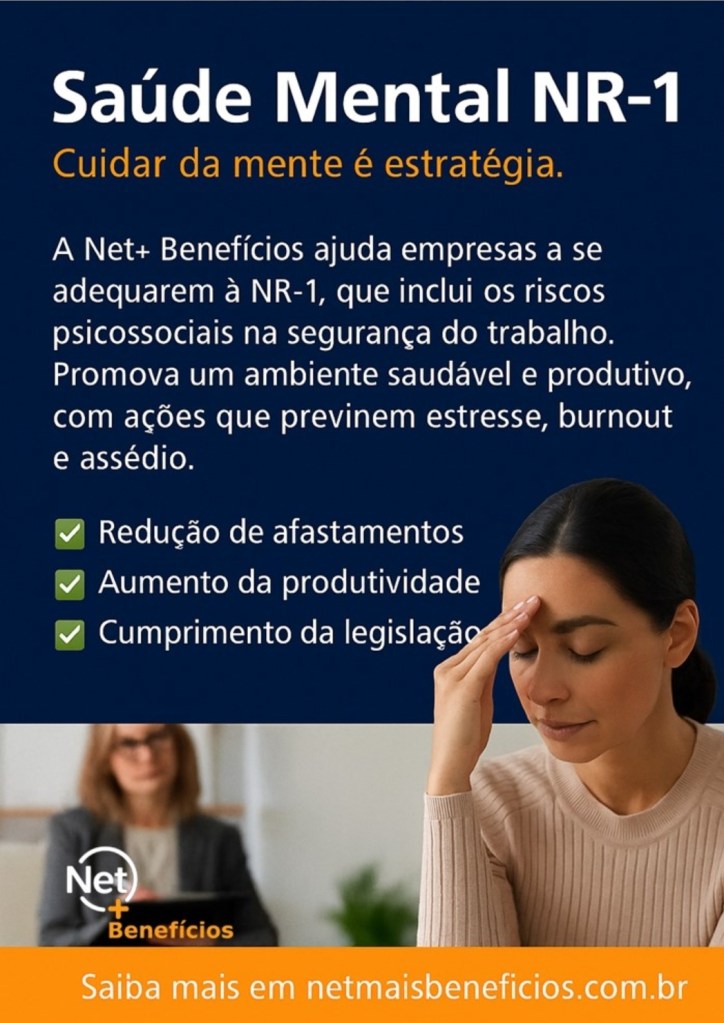 🧠 Saúde Mental NR-1Cuidar da mente é estratégia — e em breve, obrigação legal!A nova NR-1 inclui os riscos psicossociais (como estresse, burnout e assédio) na segurança do trabalho.⚠️ A exigência passa a valer em 2026, então agora é o momento de se preparar!A Net+ Benefícios ajuda sua empresa a se adequar e criar um ambiente saudável e produtivo:✅ Redução de afastamentos✅ Mais produtividade✅ Cumprimento da legislação💬 Consulte-nos para receber informações corretas e atualizadas!🔗 netmaisbeneficios.com.br#SaudeMental #NR1 #SaudeNoTrabalho #SegurancaDoTrabalho #NetMaisBeneficios #RH #BemEstar